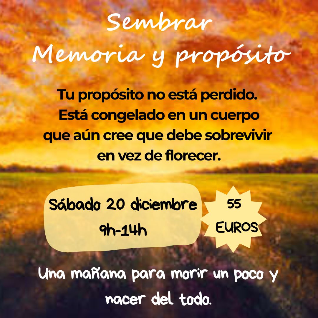 El taller se plantea como antesala del Taller que se realizará el sábado 20 de diciembre “Sembrar. Memoria y Propósito”. Este momento del año en el que se acerca el solsticio de invierno es tiempo de siembra, de comienzos, de plantar la semilla que somos, en nuestra tierra-cuerpo, para que el propósito para el nuevo año pueda llegar a buen término. Si el cuerpo está despierto y siente confianza, durante el verano podremos ver aparecer los frutos y hacia el otoño, será momento de cosechar y agradecer por todo lo que hemos conseguido.